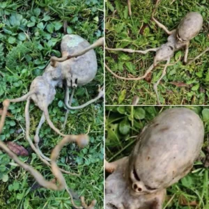 A peculiar discovery in a woman’s garden left internet users scratching their heads. Resembling something out of science fiction, the object featured an oblong skull, a slender torso, and limb-like…