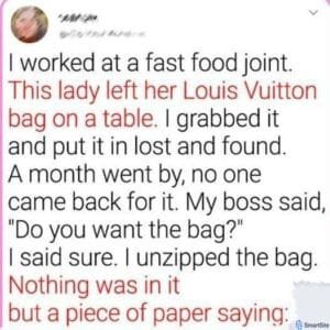 One day, while working at a fast food restaurant, I noticed a lady had left her Louis Vuitton bag on a table. After waiting 20 minutes and realizing she wasn’t…