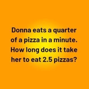Step 1: Calculate the time to eat one whole pizza Donna eats 1/4 of a pizza in 1 minute. Therefore, the time it takes for her to eat one whole…