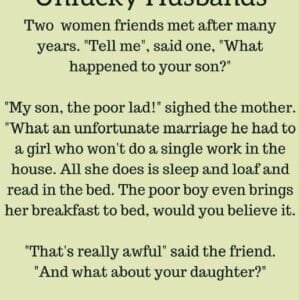 Two women friends reunited after many years. “Tell me,” one asked, “What happened to your son?” “Oh, my poor son!” sighed the mother. “His marriage is so unfortunate. He ended up with…