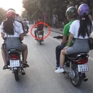 Explanation: The strange thing is that these two motorbikes have almost the same license plate number and the two girls sitting in the car are wearing identical clothes.