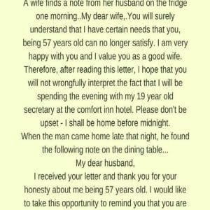 A wife finds a note from her husband on the fridge one morning.. My dear wife, You will surely understand that I have certain needs that you, being 57 years…